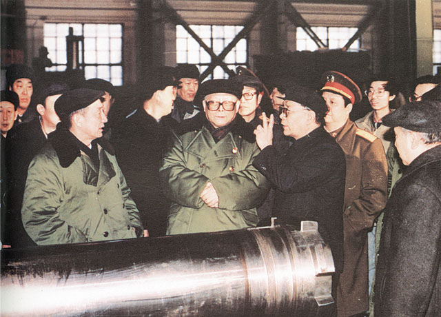 1990年2月17日中共中央總書(shū)記江澤民視察127廠時(shí)在車間聽(tīng)取匯報(bào)
