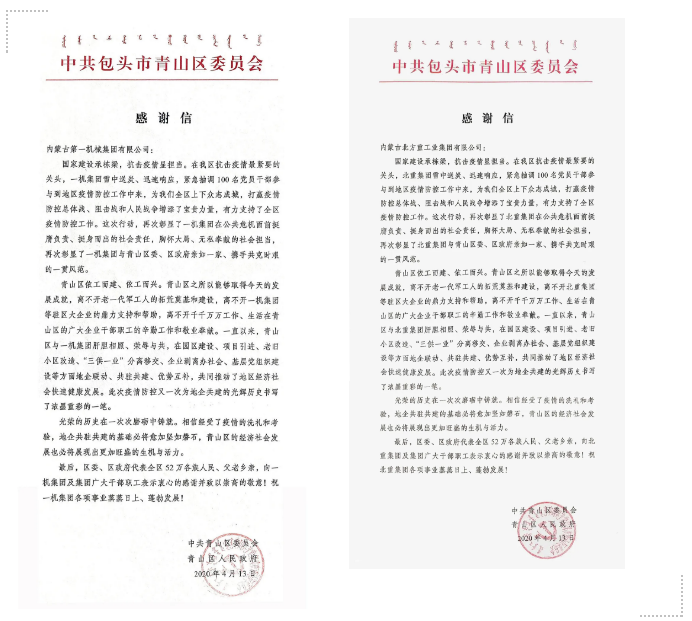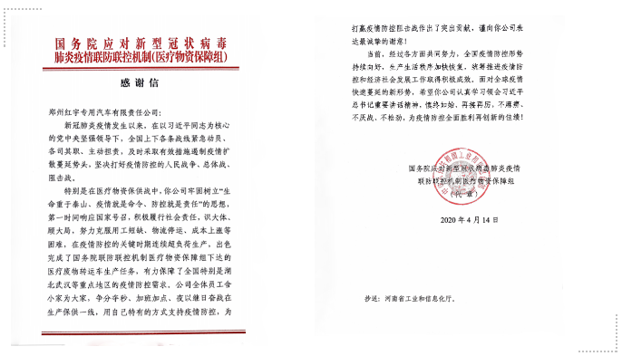 近日,中國(guó)兵器工業(yè)集團(tuán)豫西集團(tuán)鄭州紅宇專(zhuān)汽公司、一機(jī)集團(tuán)和北重集團(tuán)分別收到國(guó)務(wù)院應(yīng)對(duì)新型冠狀病毒肺炎疫情聯(lián)防聯(lián)控機(jī)制醫(yī)療物資保障組,包頭市青山區(qū)委、區(qū)政府發(fā)來(lái)的感謝信、慰問(wèn)信,對(duì)他們?cè)诖蜈A疫情防控人民戰(zhàn)爭(zhēng)、總體戰(zhàn)、阻擊戰(zhàn)中作出的貢獻(xiàn)表示感謝。 豫西集團(tuán)鄭州紅宇專(zhuān)汽公司收到國(guó)務(wù)院聯(lián)防聯(lián)控機(jī)制感謝信 4月14日,國(guó)務(wù)院應(yīng)對(duì)新型冠狀病毒肺炎疫情聯(lián)防聯(lián)控機(jī)制醫(yī)療物資保障組向中國(guó)兵器工業(yè)集團(tuán)豫西集團(tuán)鄭州紅宇專(zhuān)汽公司發(fā)來(lái)感謝信。 豫西集團(tuán)鄭州紅宇專(zhuān)汽公司收到國(guó)務(wù)院應(yīng)對(duì)新型冠狀病毒肺炎疫情聯(lián)防聯(lián)控機(jī)制醫(yī)療物資保障組發(fā)來(lái)的感謝信 信中指出,新冠肺炎疫情發(fā)生以來(lái),在以習(xí)近平同志為核心的黨中央堅(jiān)強(qiáng)領(lǐng)導(dǎo)下,全國(guó)上下各條戰(zhàn)線(xiàn)緊急動(dòng)員、各司其職、主動(dòng)擔(dān)責(zé),及時(shí)采取有效措施遏制疫情擴(kuò)散蔓延勢(shì)頭,堅(jiān)決打好疫情防控的人民戰(zhàn)爭(zhēng)、總體戰(zhàn)、阻擊戰(zhàn)。 特別是在醫(yī)療物資保供戰(zhàn)中,鄭州紅宇專(zhuān)汽公司牢固樹(shù)立“生命重于泰山、疫情就是命令、防控就是責(zé)任”的思想,第一時(shí)間響應(yīng)國(guó)家號(hào)召,積極履行社會(huì)責(zé)任,識(shí)大體、顧大局,努力克服用工短缺、物流停運(yùn)、成本上漲等困難,在疫情防控的關(guān)鍵時(shí)期連續(xù)超負(fù)荷生產(chǎn),出色完成了國(guó)務(wù)院聯(lián)防聯(lián)控機(jī)制醫(yī)療物資保障組下達(dá)的醫(yī)療廢物轉(zhuǎn)運(yùn)車(chē)生產(chǎn)任務(wù),有力保障了全國(guó)特別是湖北武漢等重點(diǎn)地區(qū)的疫情防控需求。公司全體員工舍小家為大家、爭(zhēng)分奪秒、加班加點(diǎn),夜以繼日奮戰(zhàn)在生產(chǎn)保供一線(xiàn),用自己特有的方式支持疫情防控,為打贏疫情防控阻擊戰(zhàn)作出了突出貢獻(xiàn)。 鄭州紅宇專(zhuān)汽公司緊急生產(chǎn)醫(yī)療廢物轉(zhuǎn)運(yùn)車(chē)并及時(shí)發(fā)運(yùn) 疫情發(fā)生以來(lái),鄭州紅宇專(zhuān)汽公司已簽約醫(yī)療廢物轉(zhuǎn)運(yùn)車(chē)107臺(tái),累計(jì)下線(xiàn)90臺(tái),交付83臺(tái)。 一機(jī)集團(tuán)和北重集團(tuán)收到中共包頭市青山區(qū)委員會(huì)、青山區(qū)人民政府發(fā)來(lái)的感謝信和慰問(wèn)信 4月13日,中共包頭市青山區(qū)委員會(huì)、青山區(qū)人民政府向中國(guó)兵器工業(yè)集團(tuán)一機(jī)集團(tuán)和北重集團(tuán)發(fā)來(lái)感謝信和慰問(wèn)信,對(duì)參與青山區(qū)防控疫情一線(xiàn)工作的一機(jī)集團(tuán)、北重集團(tuán)黨員干部職工及給予充分理解、全力支持的家屬們,表示衷心的感謝并致以最崇高的敬意!