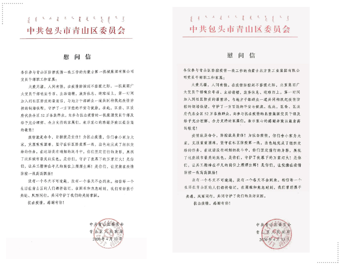 一機(jī)集團(tuán)、北重集團(tuán)收到中共包頭市青山區(qū)委員會(huì)、青山區(qū)人民政府發(fā)來(lái)的慰問(wèn)信 信中指出,在青山區(qū)抗擊疫情最緊要的關(guān)頭,一機(jī)集團(tuán)、北重集團(tuán)雪中送炭、迅速響應(yīng),分別緊急抽調(diào)百余名黨員干部參與到地區(qū)疫情防控工作中,為全區(qū)上下眾志成城,打贏疫情防控的人民戰(zhàn)爭(zhēng)、總體戰(zhàn)、阻擊戰(zhàn)增添了寶貴力量,有力支持了全區(qū)疫情防控工作,彰顯了一機(jī)集團(tuán)、北重集團(tuán)在公共危機(jī)面前挺膺負(fù)責(zé)、挺身而出的社會(huì)責(zé)任,胸懷大局、無(wú)私奉獻(xiàn)的社會(huì)擔(dān)當(dāng)。 一機(jī)集團(tuán)黨員干部馳援青山區(qū)疫情防控一線(xiàn) 北重集團(tuán)黨員干部馳援青山區(qū)疫情防控一線(xiàn) 來(lái)源/豫西集團(tuán)紅宇專(zhuān)汽公司、一機(jī)集團(tuán)、北重集團(tuán)