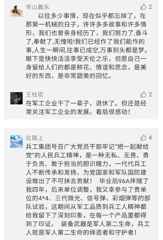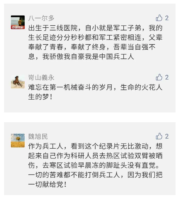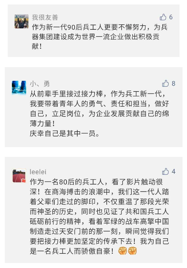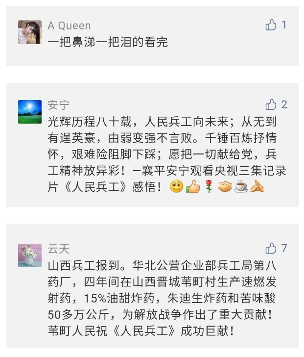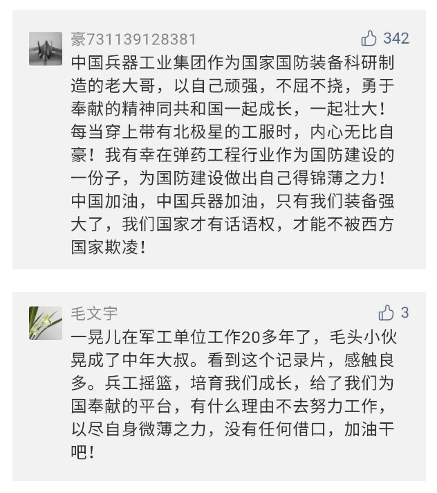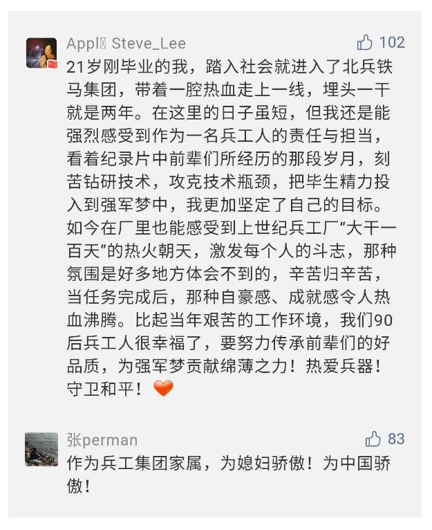 在中國共產(chǎn)黨成立九十九周年之際,由中國兵器工業(yè)集團有限公司組織攝制、反映人民兵工在黨的領導下80余年光輝奮斗歷程、廣大兵工人弘揚“把一切獻給黨”人民兵工精神的三集紀錄片《人民兵工》自7月1日-3日每晚20點在中央廣播電視總臺中文國際頻道(CCTV-4)《國家記憶》首播以來,在兵器系統(tǒng)和觀眾中引發(fā)強烈反響,很多網(wǎng)友、觀眾紛紛留言表達了自己的觀后感受。 觀眾在兵器工業(yè)集團官微的留言區(qū)直抒了觀影感受,有的熱淚盈眶,有的心潮起伏,有的興起賦詩,有的認為讓心靈得到凈化、思想得以提升,有的認為是最直觀的國防教育教材...... 影片勾起了退休老同志無限懷念、兵工人的甜美記憶、攝制期間官田中央兵工廠文化教育基地工作人員的難忘瞬間...... 相比老一輩,年a輕的兵工人也表達了傳承紅色基因,弘揚新時代“把一切獻給黨”的人民兵工精神的豪邁氣概...... 其中也不乏在校的學生,在感謝英模樹立的榜樣和豐碑的同時,也為自己的職業(yè)生涯定好坐標、做好規(guī)劃,努力前行...... 作為新時代弘揚人民兵工精神的特色文化成果,紀錄片的播出,凝聚起廣大兵器干部職工團結(jié)奮斗新時代磅礴力量,極大的增強了兵工人的自豪感,大家紛紛表達了作為軍工央企一員 “此生無悔入軍工”的使命擔當...... 《人民兵工》共分為三集,分別是《搖籃》《錘煉》《前行》,全景式展示了我們黨領導和創(chuàng)建的第一個軍事工業(yè)部門——人民兵工80余年來從無到有、從小到大、從弱到強的光輝奮斗歷程,生動講述了廣大兵工人聽黨話、跟黨走,大力弘揚“把一切獻給黨”的人民兵工精神,自力更生、艱苦奮斗、開拓進取、無私奉獻的家國情懷和感人事跡。在人民兵工80余年篳路藍縷的奮斗歷程中,涌現(xiàn)出吳運鐸、倪志福、祝榆生等一大批英模人物,在血與火的考驗中凝練形成了“把一切獻給黨”的人民兵工精神,成為人民兵工奮斗不息的紅色基因。(王珊) |