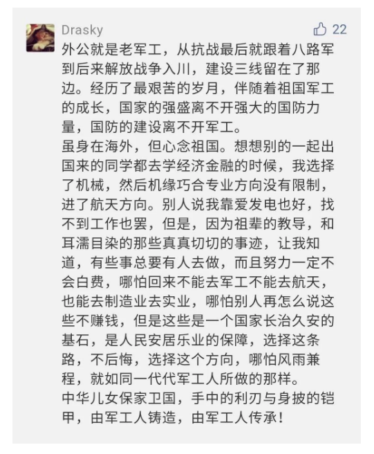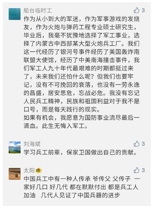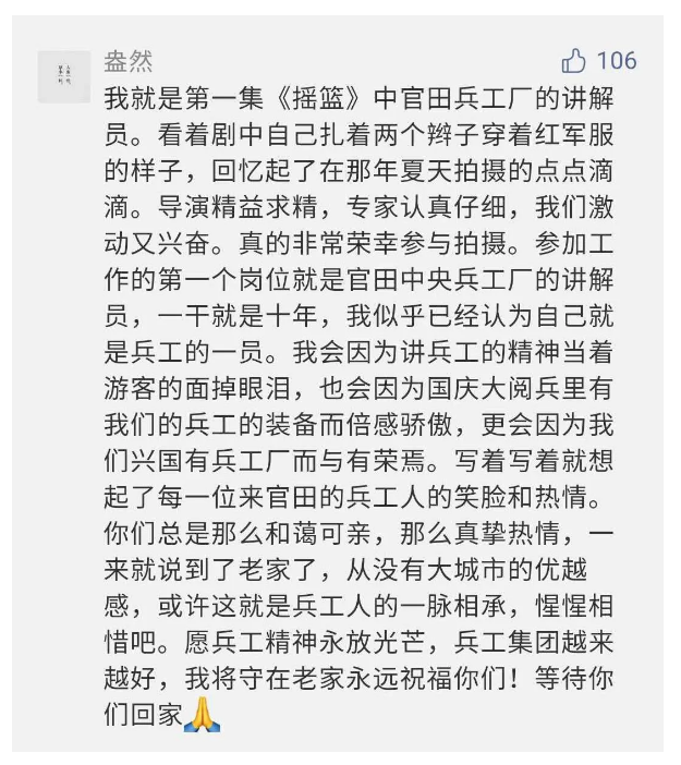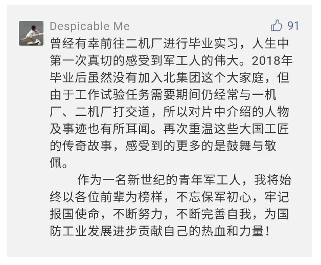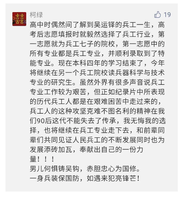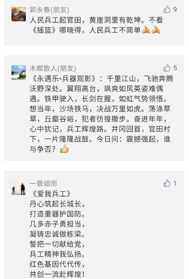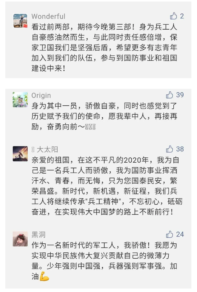 在中國共產(chǎn)黨成立九十九周年之際,由中國兵器工業(yè)集團有限公司組織攝制、反映人民兵工在黨的領導下80余年光輝奮斗歷程、廣大兵工人弘揚“把一切獻給黨”人民兵工精神的三集紀錄片《人民兵工》自7月1日-3日每晚20點在中央廣播電視總臺中文國際頻道(CCTV-4)《國家記憶》首播以來,在兵器系統(tǒng)和觀眾中引發(fā)強烈反響,很多網(wǎng)友、觀眾紛紛留言表達了自己的觀后感受。 觀眾在兵器工業(yè)集團官微的留言區(qū)直抒了觀影感受,有的熱淚盈眶,有的心潮起伏,有的興起賦詩,有的認為讓心靈得到凈化、思想得以提升,有的認為是最直觀的國防教育教材...... 影片勾起了退休老同志無限懷念、兵工人的甜美記憶、攝制期間官田中央兵工廠文化教育基地工作人員的難忘瞬間...... 相比老一輩,年a輕的兵工人也表達了傳承紅色基因,弘揚新時代“把一切獻給黨”的人民兵工精神的豪邁氣概...... 其中也不乏在校的學生,在感謝英模樹立的榜樣和豐碑的同時,也為自己的職業(yè)生涯定好坐標、做好規(guī)劃,努力前行...... 作為新時代弘揚人民兵工精神的特色文化成果,紀錄片的播出,凝聚起廣大兵器干部職工團結(jié)奮斗新時代磅礴力量,極大的增強了兵工人的自豪感,大家紛紛表達了作為軍工央企一員 “此生無悔入軍工”的使命擔當...... 《人民兵工》共分為三集,分別是《搖籃》《錘煉》《前行》,全景式展示了我們黨領導和創(chuàng)建的第一個軍事工業(yè)部門——人民兵工80余年來從無到有、從小到大、從弱到強的光輝奮斗歷程,生動講述了廣大兵工人聽黨話、跟黨走,大力弘揚“把一切獻給黨”的人民兵工精神,自力更生、艱苦奮斗、開拓進取、無私奉獻的家國情懷和感人事跡。在人民兵工80余年篳路藍縷的奮斗歷程中,涌現(xiàn)出吳運鐸、倪志福、祝榆生等一大批英模人物,在血與火的考驗中凝練形成了“把一切獻給黨”的人民兵工精神,成為人民兵工奮斗不息的紅色基因。(王珊) |