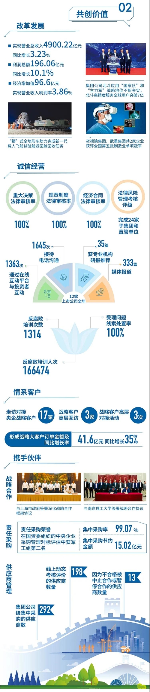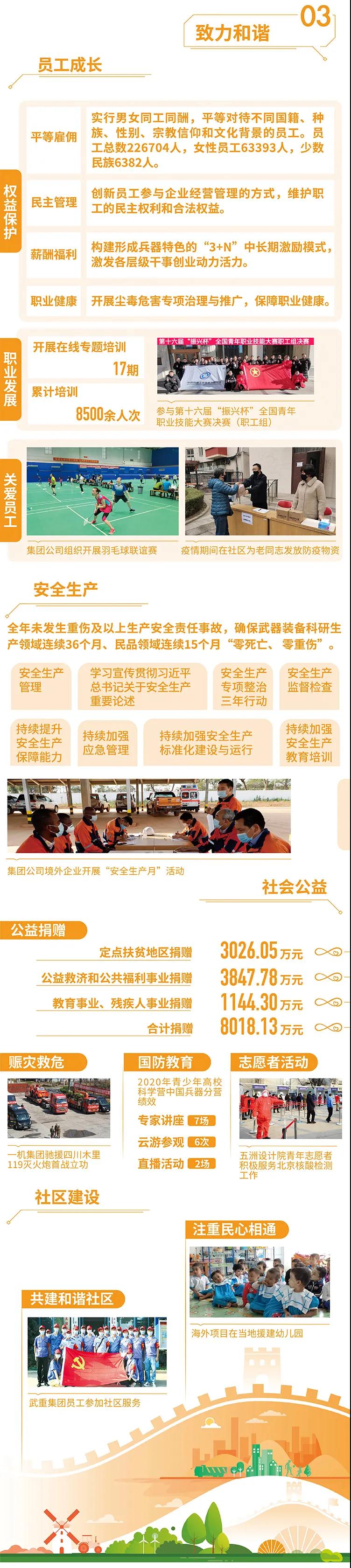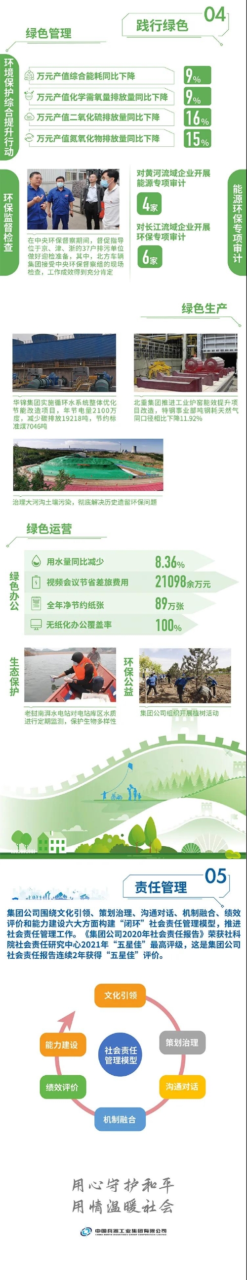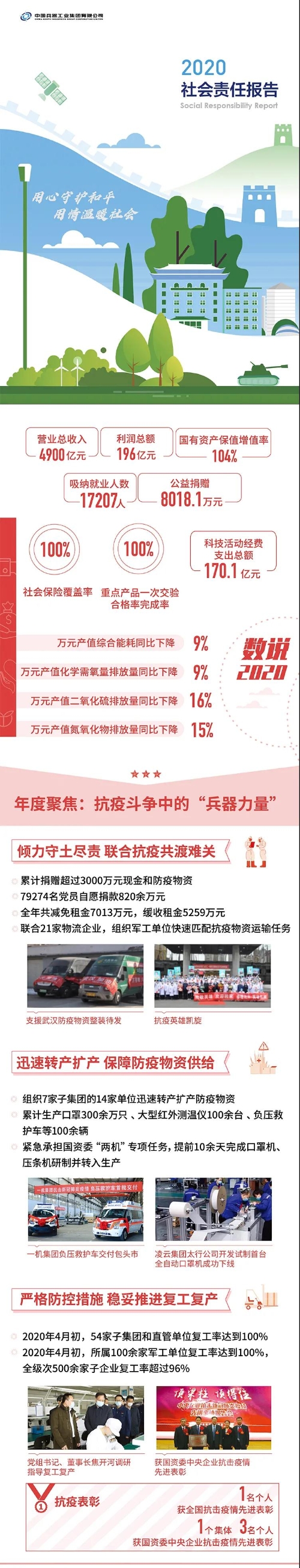 2020年,是“十三五”規(guī)劃收官之年,也是全面建成小康社會、實現(xiàn)第一個百年目標的決勝之年。集團公司黨組書記、董事長焦開河在報告開篇指出,集團公司實現(xiàn)了“十三五”圓滿收官,整體步入了高質(zhì)量發(fā)展軌道,呈現(xiàn)出基礎(chǔ)更牢、動力更強、空間更大、效能更高的積極向上良好態(tài)勢。在“十三五”特別是近三年來的工作實踐中,我們明確了“集團公司是國家安全和國防建設(shè)的脊梁、是國家戰(zhàn)略科技力量最為重要的組成部分、是黨和國家最可信賴的‘六個力量’,肩負著支撐國防軍隊建設(shè)、推動科技自立自強、服務構(gòu)建新發(fā)展格局的重大政治責任和光榮使命,具有極強的政治屬性,性質(zhì)特殊、使命特殊、責任特殊”的新時代新階段職責使命,深化了對“堅持以習近平新時代中國特色社會主義思想定向領(lǐng)航,是集團公司高質(zhì)量發(fā)展的根本遵循;保持貫徹落實習近平總書記重要指示批示和黨中央決策部署的戰(zhàn)略定力,是集團公司高質(zhì)量發(fā)展的根本前提;履行好強軍這個首要職責,是集團公司高質(zhì)量發(fā)展的根本要求;加快兵器科技創(chuàng)新突破,是集團公司高質(zhì)量發(fā)展的根本支撐;加強黨的領(lǐng)導黨的建設(shè),是集團公司高質(zhì)量發(fā)展的根本保證”的兵器工業(yè)改革發(fā)展規(guī)律認識。 《報告》聚焦“抗疫斗爭中的‘兵器力量’”,生動展示了集團公司抗擊疫情的有力行動,展現(xiàn)了集中力量辦大事、急國家之所急的“兵器速度”,彰顯了“把一切獻給黨”的人民兵工精神和貫徹落實國家決策部署的責任擔當?!秷蟾妗芬浴坝眯氖睾蚝推?、用情溫暖社會”為主題,從恪守本責、共創(chuàng)價值、致力和諧、踐行綠色、責任管理五個維度,全面展現(xiàn)集團公司在堅持履行政治責任、經(jīng)濟責任、社會責任,履行強軍首責、加強黨的建設(shè)、打造國家戰(zhàn)略科技力量、推進“一帶一路”倡議、打好打贏三大攻堅戰(zhàn)、深化改革、助力員工成長、支持社會公益事業(yè)、提升社會責任管理等方面的生動實踐和履責亮點,凸顯集團公司保持貫徹落實黨中央決策部署的戰(zhàn)略定力、在聚焦主責主業(yè)、科技引領(lǐng)、國際化經(jīng)營上持續(xù)用力,為實現(xiàn)第一個百年奮斗目標貢獻力量的初心與行動?!秷蟾妗吩俅潍@得中國企業(yè)社會責任報告評級專家委員會“五星佳”最高評級,兵器工業(yè)集團成為軍工行業(yè)唯一連續(xù)10年獲得最高評級的企業(yè)。 2021年是開啟新征程的開局之年,也是建黨100周年、人民兵工創(chuàng)建90周年,兵器工業(yè)集團將全面貫徹落實黨中央戰(zhàn)略部署,緊扣推動高質(zhì)量發(fā)展主題,圍繞“十四五”開好局、起好步,堅決完成黨中央賦予的職責使命,履行好中央企業(yè)和軍工集團的政治責任、經(jīng)濟責任、社會責任,為實現(xiàn)中國夢強軍夢作出新的更大貢獻! 一圖看懂《中國兵器工業(yè)集團有限公司2020年社會責任報告》
