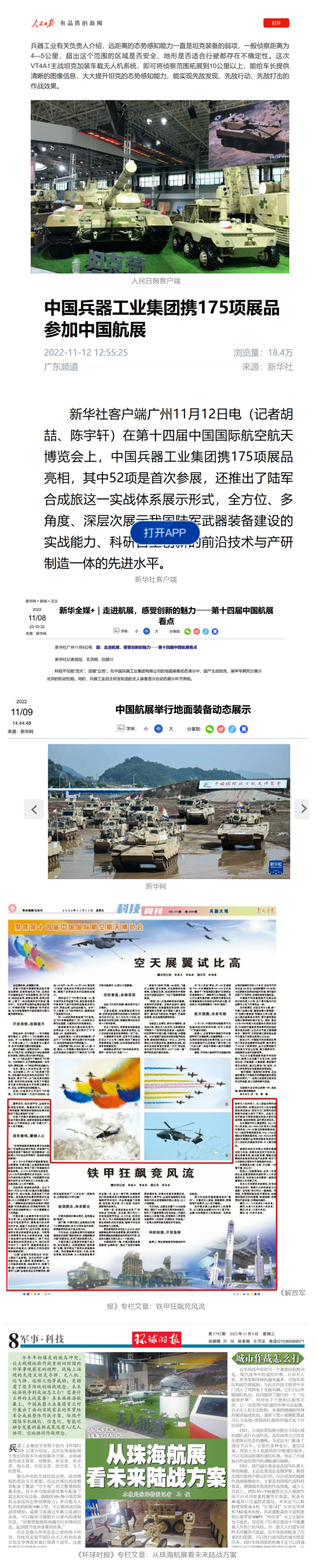 央視國防軍事頻道航展特別報道《炫舞天地間》11月12日《賞“鐵甲雄風(fēng)”!看航展地面裝備“鋼鐵洪流”名場面》對兵器工業(yè)集團武器裝備特色亮點進行報道?!秶儡娛略鐖蟆?1月7日推出報道《第十四屆中國國際航空航天博覽會明天開幕 中國兵器館首次以陸軍合成旅實戰(zhàn)體系形式展出》,對兵器館陸軍合成旅實戰(zhàn)體系進行報道。《軍事報道》11月9日推出《第十四屆中國國際航空航天博覽會 地面兵器裝備首次聯(lián)合陸航直升機進行動態(tài)展示》報道。《軍迷行天下》11月9日推出報道《軍迷打卡航展2022》以專業(yè)軍迷視角探館兵器館,全面展示兵器工業(yè)集團參展裝備特色亮點。