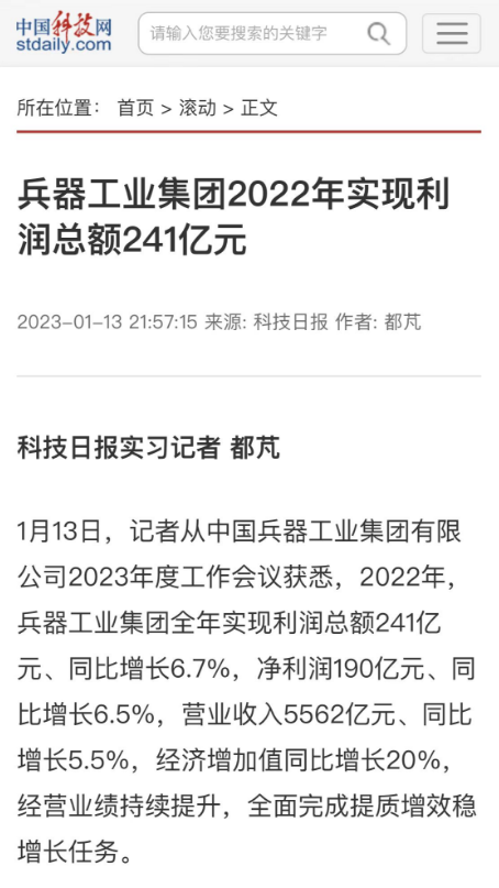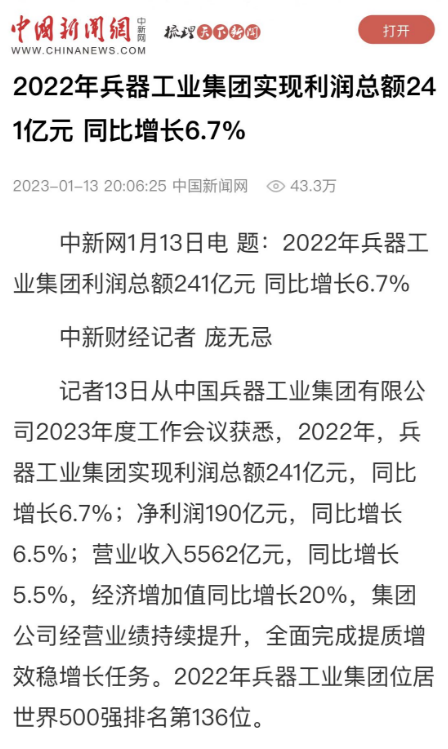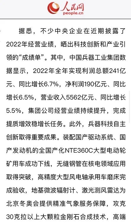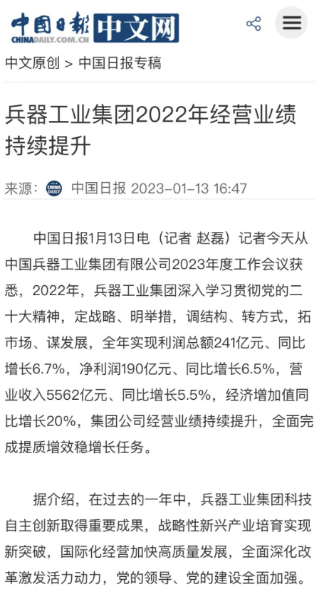 1月13日,中國兵器工業(yè)集團有限公司召開2023年度工作會議,傳達(dá)學(xué)習(xí)中央領(lǐng)導(dǎo)同志、軍方首長和上級部門重要批示,總結(jié)集團公司2022年工作,研究部署2023年主要工作任務(wù)。 集團公司2022年重點工作取得的成績及下一步的改革發(fā)展受到社會媒體廣泛關(guān)注。新華社、新華財經(jīng)、人民網(wǎng)、經(jīng)濟日報客戶端、光明日報客戶端、中國日報網(wǎng)、中國科技網(wǎng)、中國新聞網(wǎng)、央廣網(wǎng)、國資委網(wǎng)站、學(xué)習(xí)強國中央企業(yè)學(xué)習(xí)平臺、新浪網(wǎng)、騰訊網(wǎng)、搜狐網(wǎng)、網(wǎng)易網(wǎng)、今日頭條等中央主流媒體、國家部委網(wǎng)站及知名網(wǎng)絡(luò)媒體對集團公司工作會議進(jìn)行了報道,重點關(guān)注集團公司高質(zhì)量發(fā)展、科技創(chuàng)新、戰(zhàn)略性新興產(chǎn)業(yè)培育、深化改革、國際化經(jīng)營、履行央企社會責(zé)任等內(nèi)容。其中新華社以《北斗時空智能服務(wù)平臺累計服務(wù)終端數(shù)突破15億》為題,重點報道了集團公司2022年在自主創(chuàng)新、戰(zhàn)略新興產(chǎn)業(yè)培育、專利申請等方面取得的成績;經(jīng)濟日報客戶端、光明日報客戶端、中國日報網(wǎng)等以《兵器工業(yè)集團2022年經(jīng)營業(yè)績持續(xù)提升》為題,重點報道了集團公司在高質(zhì)量發(fā)展、全面完成提質(zhì)增效穩(wěn)增長方面取得的成績。集團公司門戶網(wǎng)站、微信公眾號、微博等新媒體也對集團公司工作會議進(jìn)行了及時報道,各成員單位紛紛對相關(guān)內(nèi)容進(jìn)行轉(zhuǎn)載,引發(fā)全系統(tǒng)關(guān)注。 新華社:北斗時空智能服務(wù)平臺累計服務(wù)終端數(shù)突破15億 新華財經(jīng):兵器工業(yè)集團2022年實現(xiàn)凈利潤190億元 同比增長6.5% 人民網(wǎng):2022年中央企業(yè)營收同比增長8.3% 科技創(chuàng)新成效顯著 經(jīng)濟日報客戶端:兵器工業(yè)集團2022年經(jīng)營業(yè)績持續(xù)提升 光明日報客戶端:兵器工業(yè)集團2022年經(jīng)營業(yè)績持續(xù)提升 中國日報網(wǎng):兵器工業(yè)集團2022年經(jīng)營業(yè)績持續(xù)提升 中國科技網(wǎng):兵器工業(yè)集團2022年實現(xiàn)利潤總額241億元 中國新聞網(wǎng):2022年兵器工業(yè)集團實現(xiàn)利潤總額241億元 同比增長6.7% 國資委網(wǎng)站:2022年兵器工業(yè)集團實現(xiàn)利潤總額241億元 同比增長6.7% 學(xué)習(xí)強國中央企業(yè)學(xué)習(xí)平臺:兵器工業(yè)集團2022年經(jīng)營業(yè)績持續(xù)提升 集團公司職工及廣大網(wǎng)友熱議工作會議 “這次會議全面總結(jié)了2022年工作,深入分析研判當(dāng)前形勢,部署2023年重點工作,為我們做好2023年及今后一個時期的工作明確了目標(biāo)、堅定了信心。” “作為兵工人,我要苦練內(nèi)功、不懼挑戰(zhàn)、奮勇向前,為建設(shè)具有全球競爭力的世界一流集團公司貢獻(xiàn)自己的力量?!?/p> “聚焦高科技領(lǐng)域,制造更多的大國重器,讓更多的產(chǎn)品服務(wù)老百姓?!?/p> “在不平凡的2022年取得了亮眼的工作成績,為兵器工業(yè)點贊?!?/p> “希望能有更多新型武器裝備部隊,2023年,望你們再創(chuàng)輝煌,加油!” |