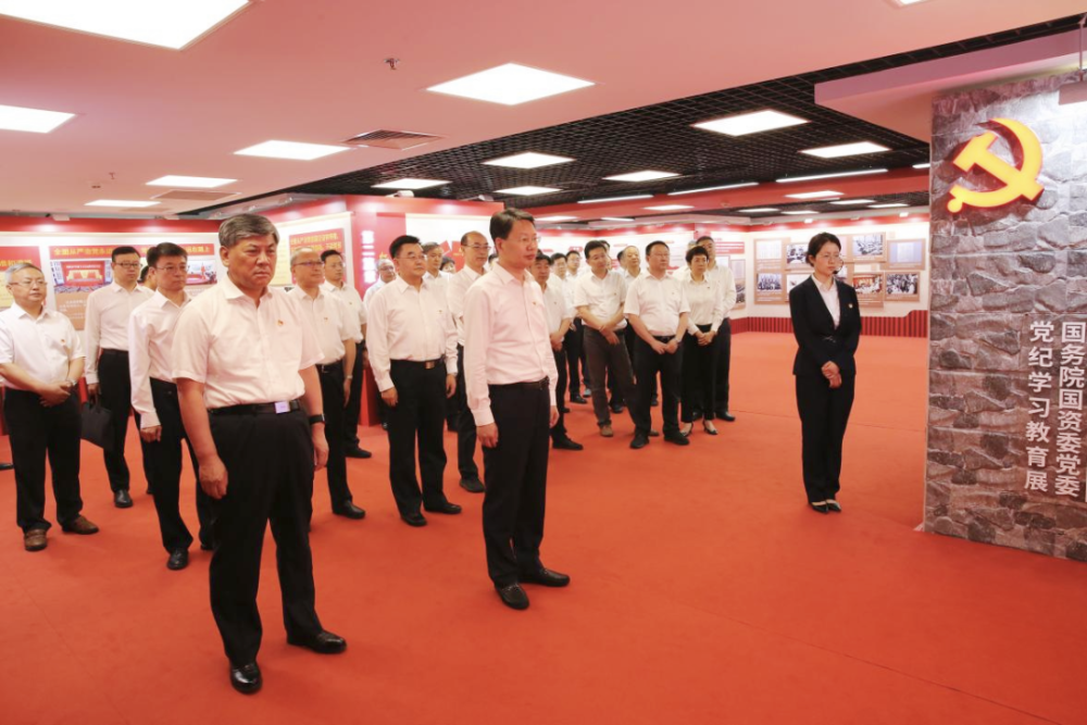 黨組同志認(rèn)真聆聽講解,集體參觀了“政治鑄魂——習(xí)近平總書記重要論述”“紀(jì)法樹威——黨規(guī)黨紀(jì)相關(guān)要求”“傳承增信——黨的優(yōu)良傳統(tǒng)”“嚴(yán)管促行——國(guó)務(wù)院國(guó)資委黨委紀(jì)律建設(shè)成效”“警示立戒——反面典型案例”“實(shí)干建功——工作展望”6個(gè)篇章,通過(guò)觀看圖文、視頻等形式多樣的展品展示,進(jìn)一步學(xué)習(xí)領(lǐng)會(huì)習(xí)近平總書記關(guān)于國(guó)資央企的重要指示批示精神和黨的紀(jì)律建設(shè)的重要論述,學(xué)習(xí)把握《中國(guó)共產(chǎn)黨紀(jì)律處分條例》新增、修訂內(nèi)容,全面了解國(guó)務(wù)院國(guó)資委黨委強(qiáng)化政治引領(lǐng)、加強(qiáng)政治監(jiān)督、深化紀(jì)律建設(shè)、抓實(shí)巡視工作等方面的做法舉措,集中觀看近年來(lái)國(guó)資央企發(fā)生的具有代表性的違規(guī)違紀(jì)案例,深刻領(lǐng)悟以習(xí)近平同志為核心的黨中央堅(jiān)持黨要管黨、全面從嚴(yán)治黨取得的歷史性成就,全面感受國(guó)務(wù)院國(guó)資委黨委全面從嚴(yán)治黨取得的重要成果。